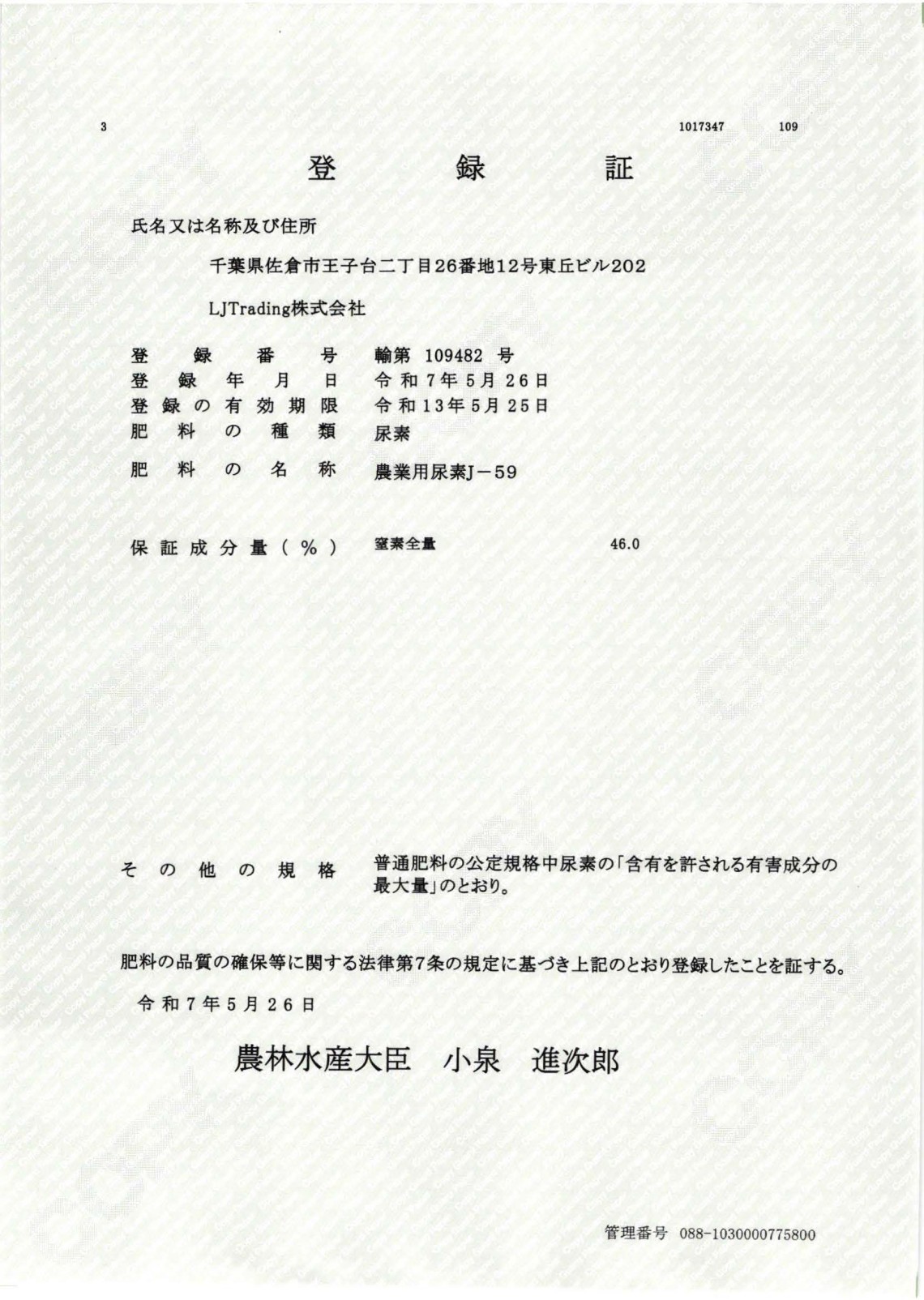 先月5/26、『農業用尿素』の登録を完了しました。